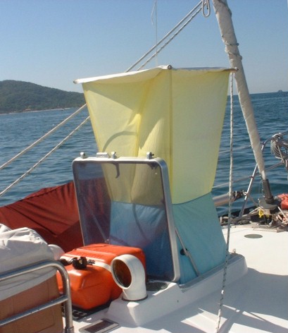 This 4-way windscoop was handmade for me by Marsha of Loup de Mer. She chose the kind of spinnaker material I love, thin and crinkly, with a beautiful color scheme to ensure pleasant dreams. If the breeze is light, my crew sometimes borrows it to hang above the V-berth hatch so more wind can come into the boat. But as soon as they take it down, I'm on it!
