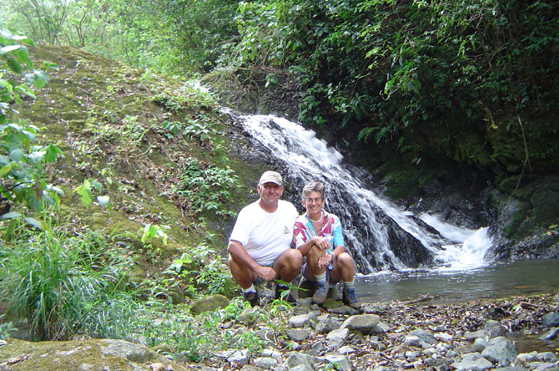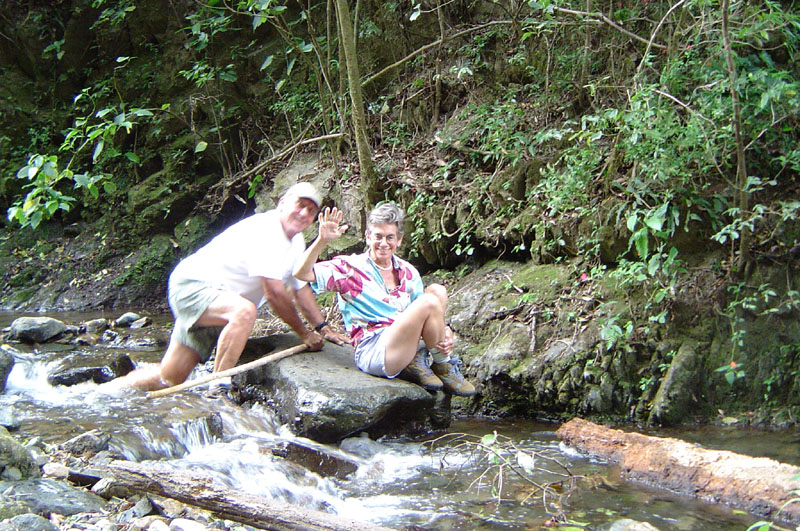A picture-perfect creek was irresistible. Les put the camera in "auto" mode and tried to run across the creek before the shutter snapped, slipping on a rock but posing with a smile as he fell--celebrity material! With a little practice, we chose a safer spot and took a fairly calm picture--but not half as funny.