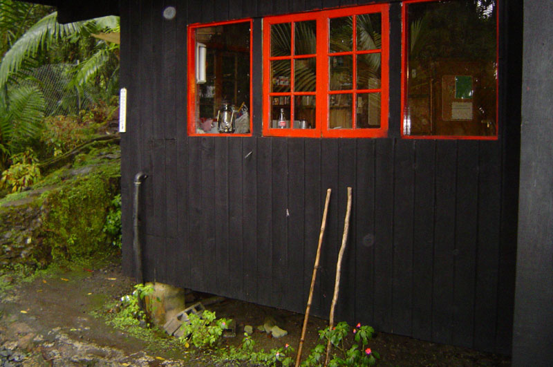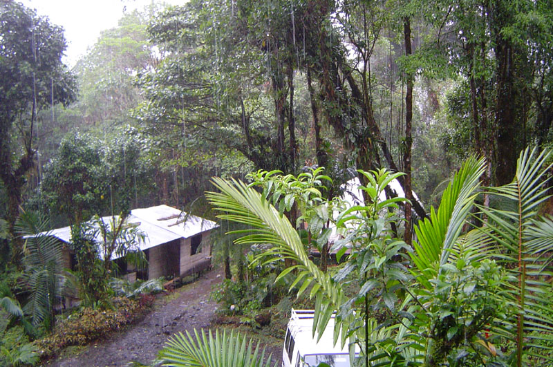 It did indeed look like quetzal country: trees so thick you couldn't have seen the sky even if it weren't raining buckets. Their 4-wheel vehicle drove us through a boulder-bedded creek to the cabin shown above. Rustic was definitely the tone.