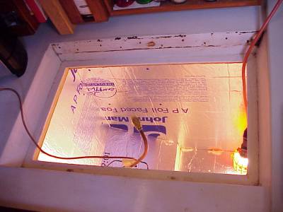 Now we needed to collect the materials necessary to reconstruct our new icebox. Fortunately, Home Depot was a bus ride away and the marine stores, West Marine, San Diego Marine Exchange, Downwind Marine, were just a couple of blocks away. After a day of assembling the material: 1 4'x8' sheet of plywood, 2 4'x8' sheets of R-14 closed-cell foam, glue, epoxy, fiberglass cloth and cans of injectable closed cell foam. We are now ready to begin.....8 days later we have an icebox again!