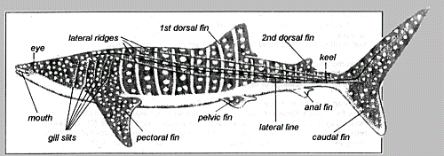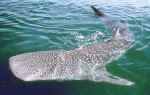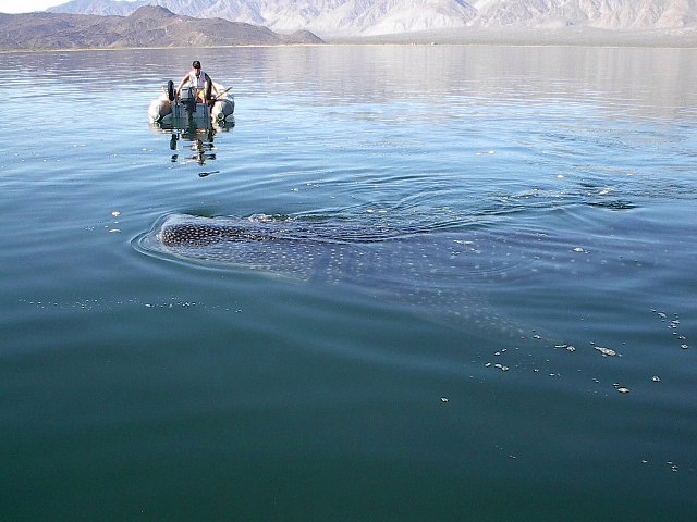 A whale shark is not a whale. It is a shark without the frenzied behavior and carnivorous habits we fear. Although they weigh up to 15 tons (that's twice as much as our boat) with a mouth up to 4 feet wide, we are not targets for them because they are filter feeders. They have 300 rows of very tiny teeth (each row has hundreds of little teeth)--just the right size for munching on plankton. The three sharks we encountered were 25 to 40 feet long, cruising around our anchorage and stopping everyone in their tracks. You can visit Bahia de Los Angeles and see them for yourself, but hurry--whale sharks only live to be about 100 years old.