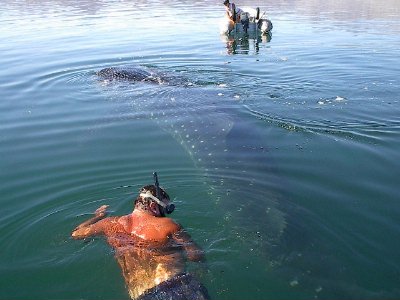 Coming at you, these stealthy creatures are easy to underestimate. But in the rare case where you get to swim with them, they are awesome. Dreamweaver's Chris Butts approaches cautiously with Les flanking him. By holding on to the dorsal fin they were able to go along for a few minutes' ride--