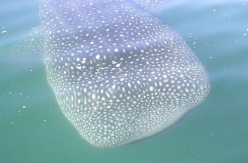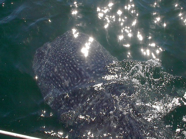 We were fortunate enough to encounter these lovely creatures again--this time from our dinghy, giving us a "close-up & personal" experience. Glassy, early-morning waters revealed a spotted mound, which at first looked just like a turtle. But when Diane came up to it, she realized we had hit "gold": a 35-foot whaleshark.